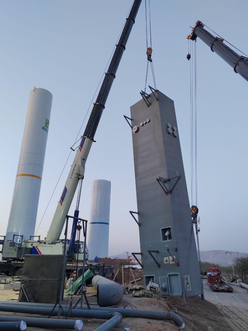 为确保项目如期完工,429日,施工人员连夜开始吊装换热器冷箱。冷箱内承接膨胀机制冷、保冷,分馏塔分离氧气、氮气,产生液氧、液氮产品,冷箱内的每台设备均在空分装置中起着举足轻重的作用,是空气分离的核心设备。